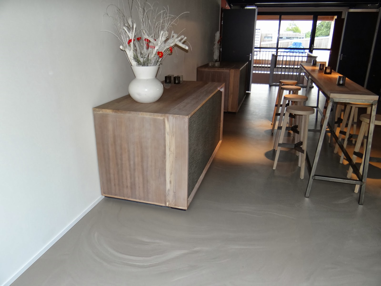 De Ongepolijste Sfeer Van Beton Maar Toch Warm En Comfortabel Een Stoere Naadloze Pvc Vloer Die Perfect Te Com Woonkamervloer Interieur Kantoor Aan Huis Decor